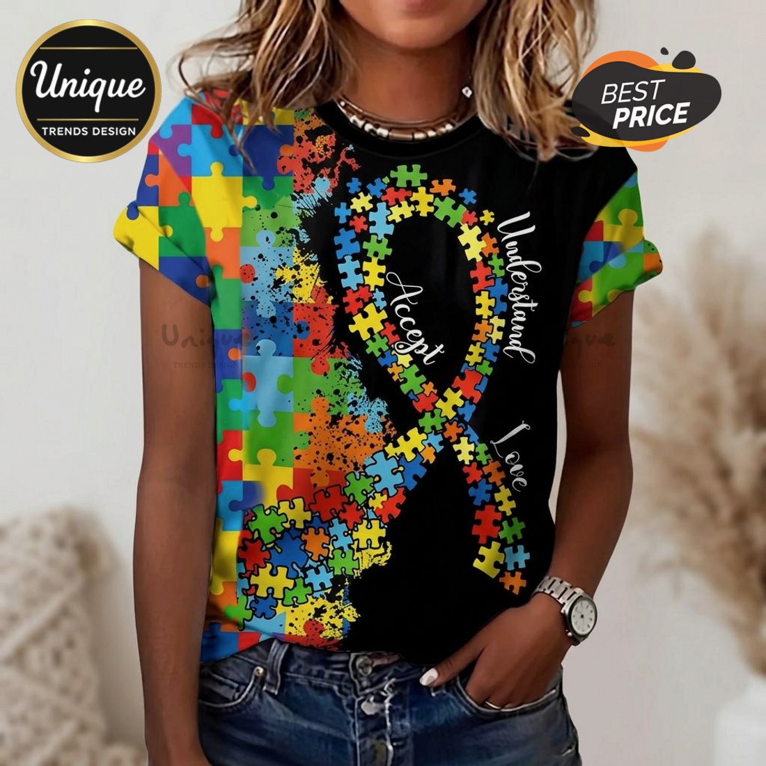 Autism Awareness Puzzle Ribbon Understand Accept Love Graphic T-Shirt Information