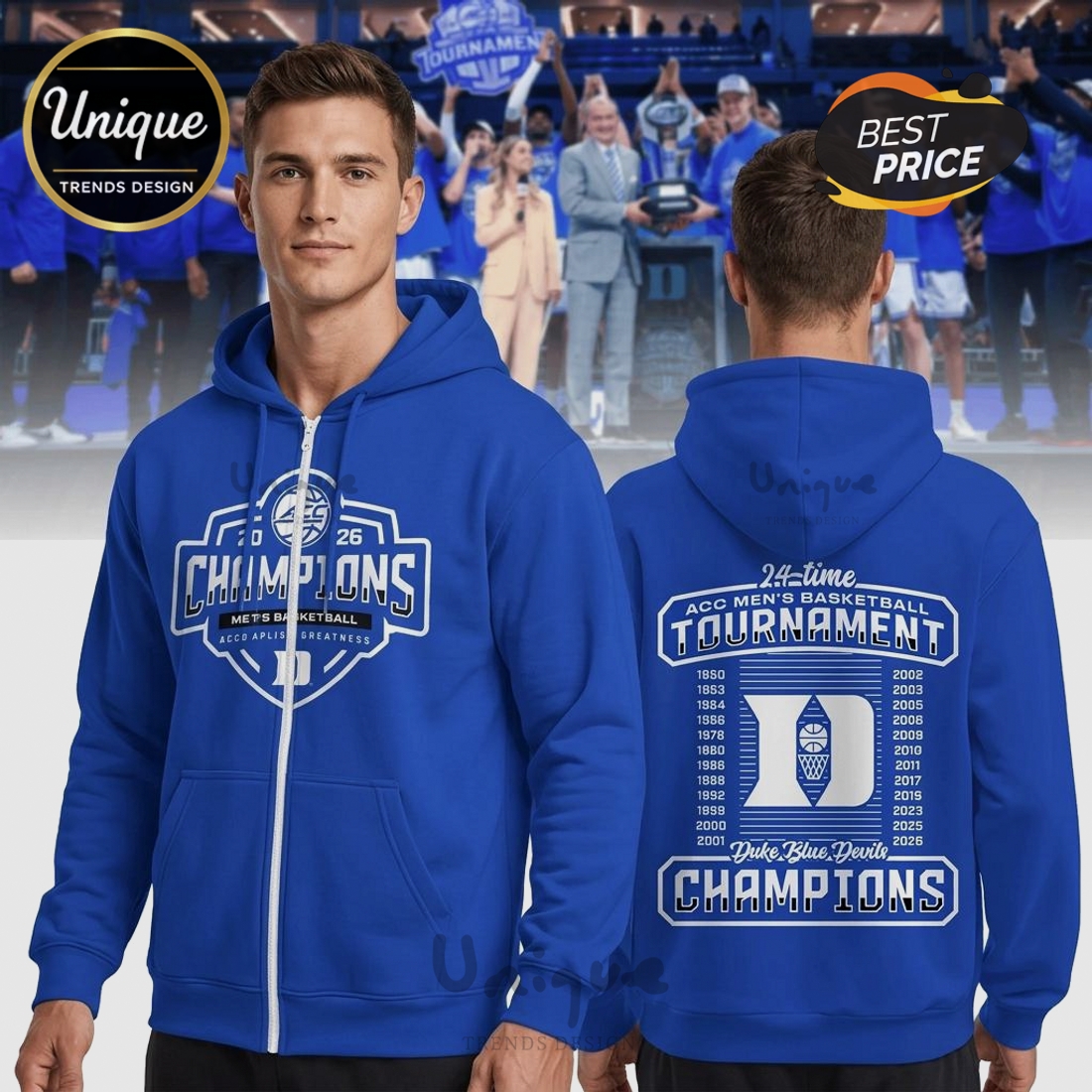 Duke Blue Devils 2026 Champions Basketball Tournament Zip Hoodie Information