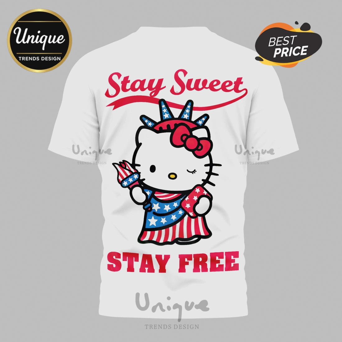 Epic Fanatic GearHello Kitty Stay Sweet Stay Free Patriotic 3D Graphic Tee Shirt