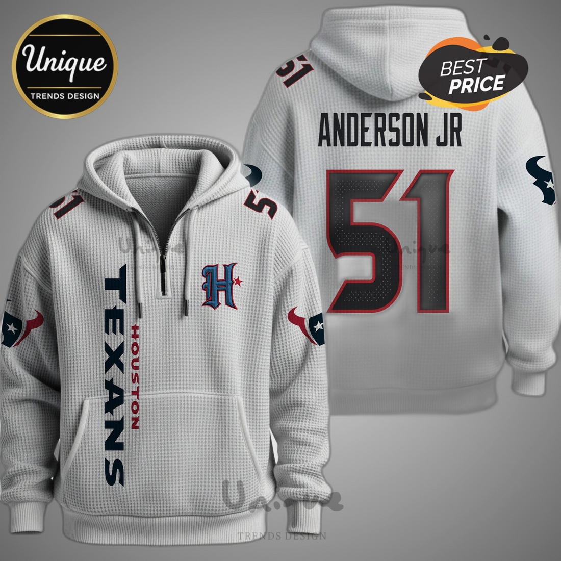This isn’t just a hoodie; it’s a declaration. Stand with the Houston Texans and Anderson Jr. 51 in this quarter-zip waffle hoodie, built for the most dedicated fans who live and breathe the game.