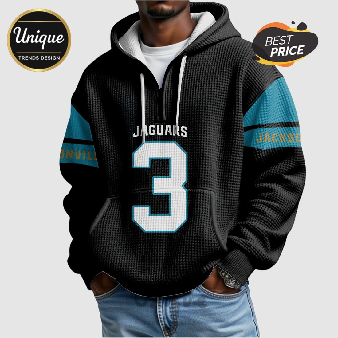 Beyond its material and design, the hoodie is engineered for a comfortable, athletic fit that allows for a full range of motion without feeling restrictive. The careful tailoring ensures a flattering silhouette that isn’t overly baggy but still accommodates layering underneath. Details like ribbed cuffs and hem contribute to a secure fit, preventing cold air from seeping in and maintaining the garment’s shape over time, resisting stretching or sagging. Many iterations of this style also include a spacious kangaroo pocket or discreet side pockets, offering practical storage for small essentials or a convenient spot to warm your hands. This particular hoodie meets the needs of a diverse range of customers: for the devoted Jaguars fan, it’s a premium, durable way to express support for both the team and a specific player, moving beyond basic game-day attire to a piece that can be worn regularly. For those prioritizing comfort, the unique waffle knit and thoughtful construction provide an unmatched level of coziness. And for individuals seeking versatile, stylish casual wear, its modern design, layering capabilities, and quality craftsmanship make it an indispensable addition, effortlessly bridging the gap between spirited fan gear and everyday fashion. It’s more than just a hoodie; it’s a declaration of fandom, a testament to comfort, and a smart investment in versatile apparel.