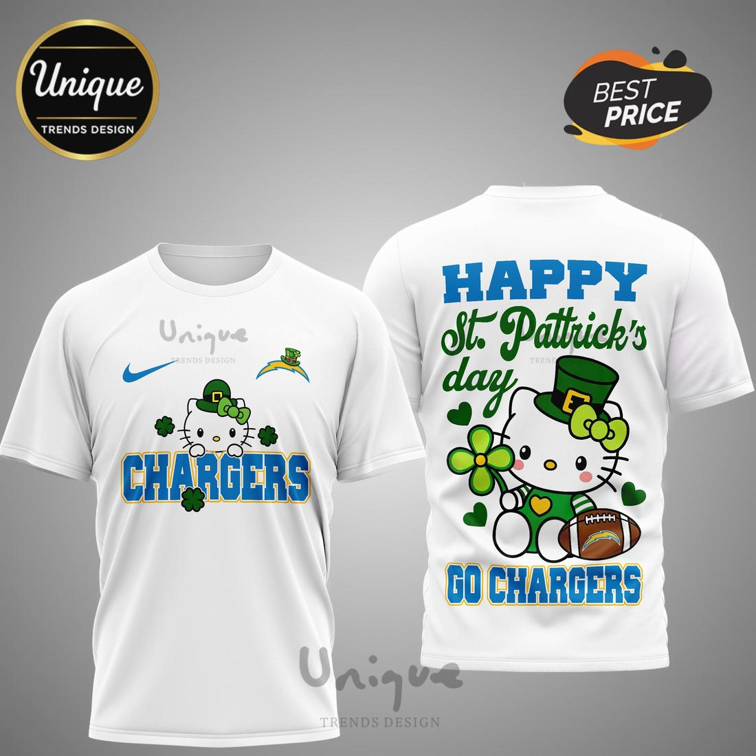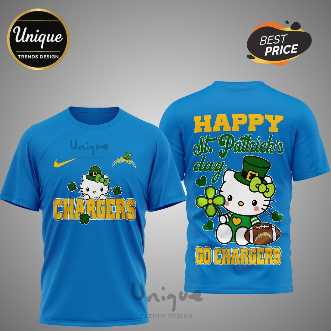 Los Angeles Chargers Premium NFL Hello Kitty St. Pattrick’s Day 3D Shirt Information