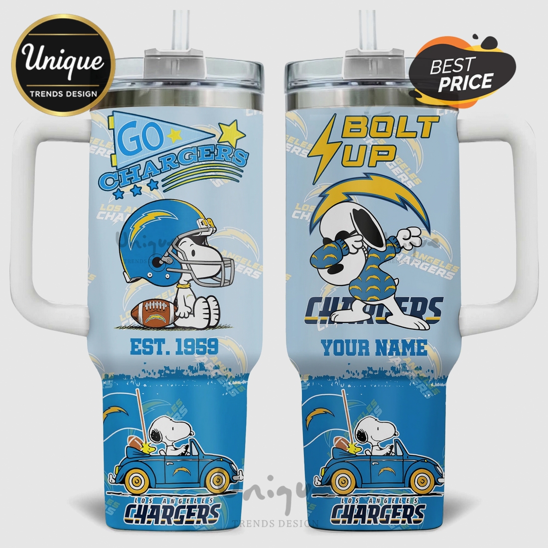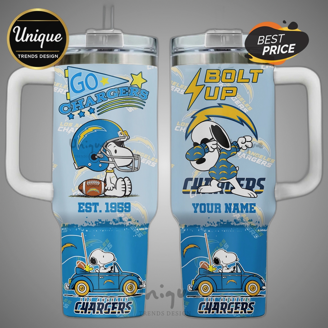 Beyond its functional excellence, the tumbler’s aesthetic appeal is what truly distinguishes it for the Chargers faithful. It vibrantly showcases the iconic Los Angeles Chargers colors – the striking powder blue and sunshine yellow – forming the backdrop for a playful yet spirited design. Central to this design is the beloved Snoopy, depicted in an energetic pose, likely sporting Chargers gear or interacting playfully with the team’s famous lightning bolt logo. This unique collaboration marries the timeless charm of Charles Schulz’s Peanuts character with the unmistakable pride of the Chargers, creating a piece that’s both an expression of team loyalty and a nostalgic conversation starter. Phrases like “Go Chargers” and “Bolt Up” are likely integrated into the design, further amplifying the fan message. This specific imagery caters directly to fans who appreciate a distinctive way to express their allegiance, moving beyond generic team merchandise to something with character and a touch of whimsy.