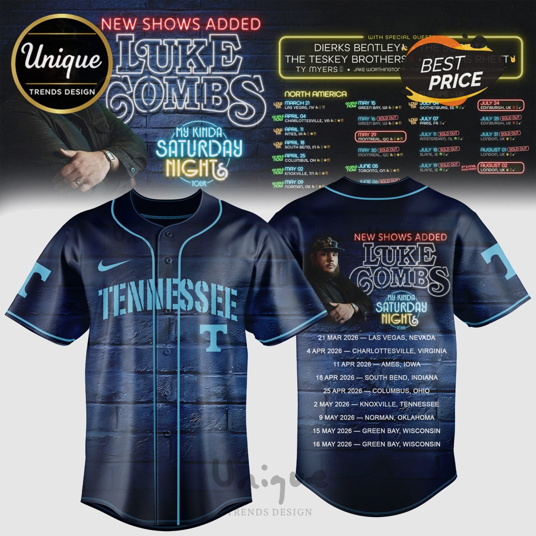 Luke Combs My Kinda Saturday Night Tour 2026 Country Music Baseball Jersey Details
