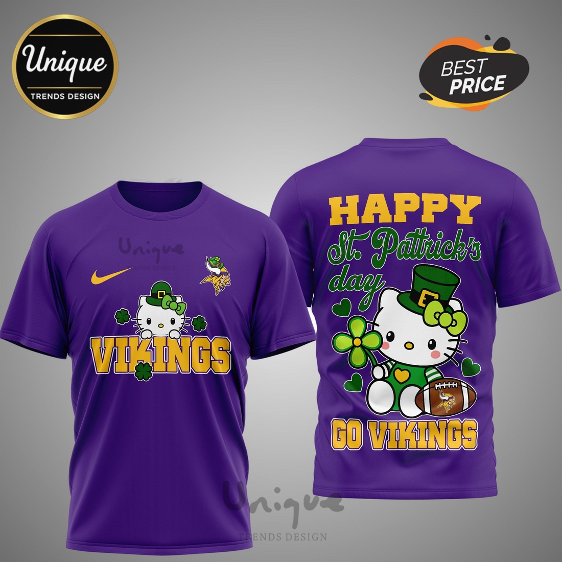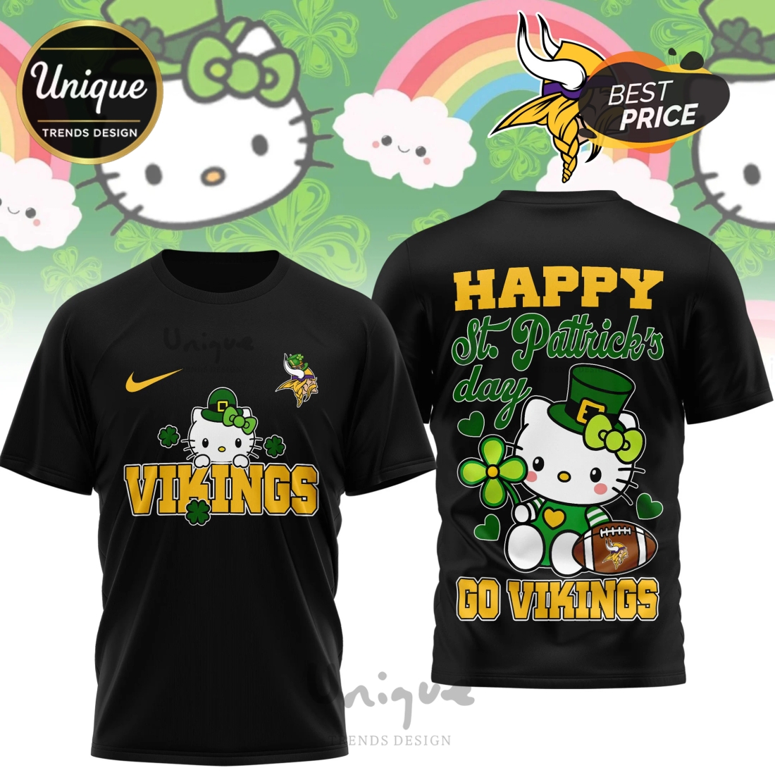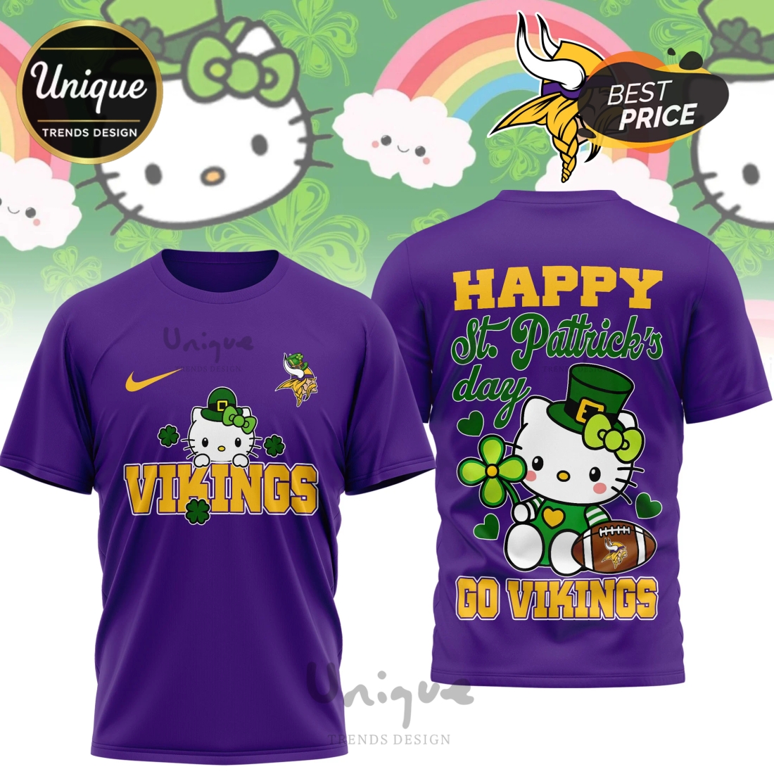 Beyond its captivating aesthetics, this item stands as a premium NFL product, signifying official licensing and adherence to stringent quality standards set by the league. This means customers can expect superior material quality, typically a soft, breathable, and durable polyester blend that offers exceptional comfort for all-day wear, whether cheering from the stands, attending a St. Patrick’s Day parade, or simply enjoying a casual outing. The fabric is chosen not only for its luxurious feel against the skin but also for its ability to perfectly hold the intricate 3D sublimation print, ensuring the colors remain vibrant and the details sharp, wash after wash, without fading, cracking, or peeling. The shirt’s construction emphasizes a comfortable, relaxed fit suitable for various body types, providing freedom of movement while maintaining a stylish silhouette. For the discerning customer, the advantages are clear: this product satisfies the need for officially recognized fan apparel, offering an authentic way to support the Minnesota Vikings while also indulging in a penchant for unique, high-quality, and conversation-starting fashion. It serves as an ideal gift for the Vikings fan who has everything, the Hello Kitty enthusiast looking for an unexpected crossover, or anyone eager to make a memorable statement on St. Patrick’s Day and beyond, solidifying its place as a truly special and invaluable addition to any fan’s wardrobe.