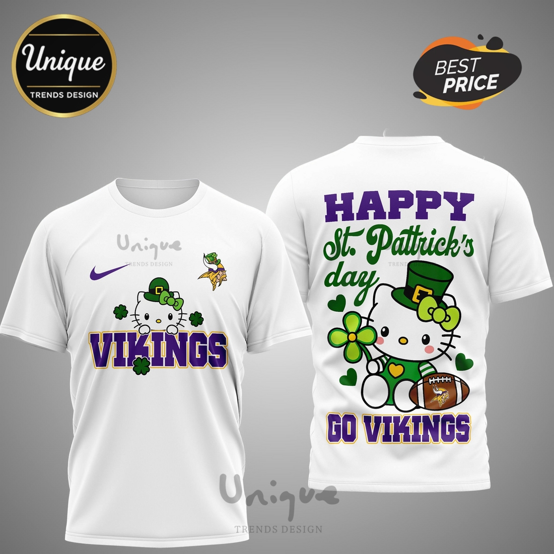 *U.S. only. Final sale items cannot be returned or exchanged.Minnesota Vikings Premium NFL Hello Kitty St. Pattrick’s Day 3D Shirt Overview