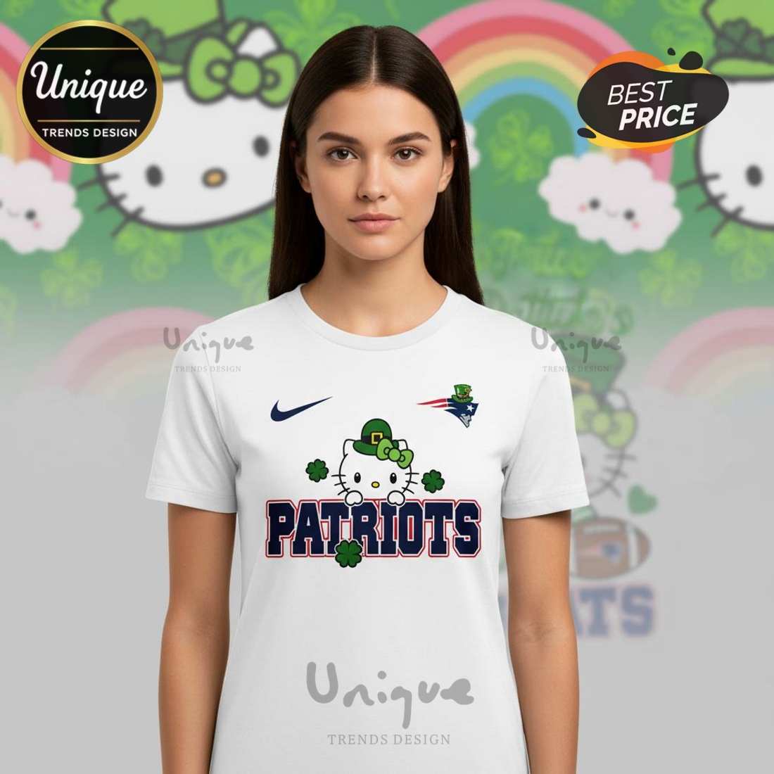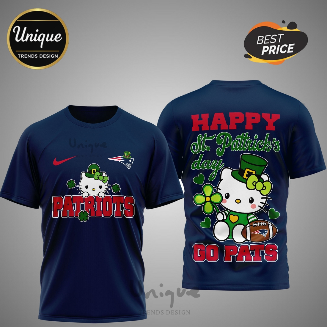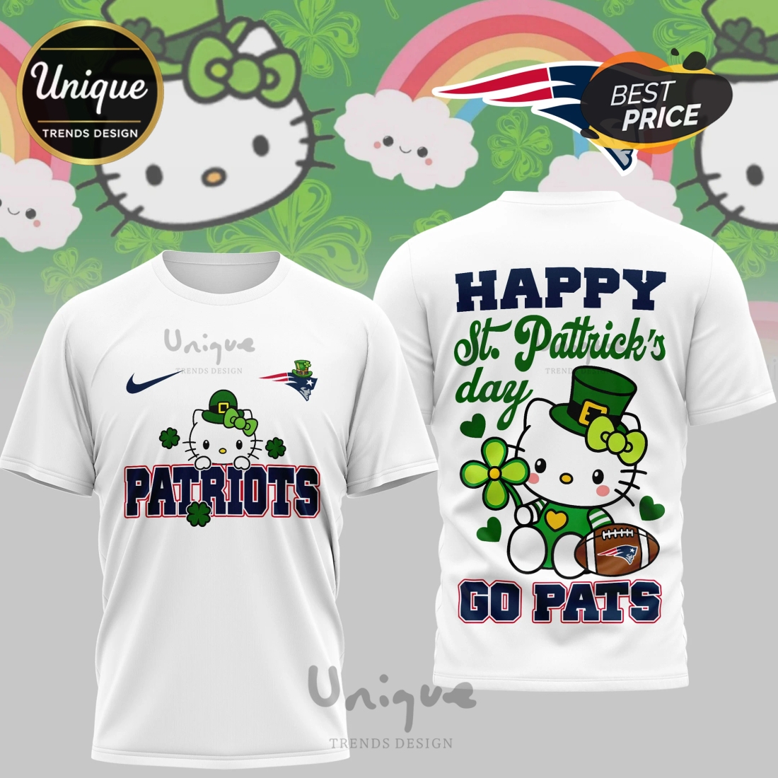 This unique shirt addresses a diverse set of needs for potential customers. For the die-hard New England Patriots fan, it offers an unconventional yet unmistakably spirited way to display allegiance, moving beyond generic team merchandise into a realm of unique, holiday-specific expression. For enthusiasts of Hello Kitty, it provides an exciting opportunity to combine their passion for the beloved character with their sports fandom, presenting Hello Kitty in a fresh, unexpected context. And for anyone eager to fully immerse themselves in the St. Patrick’s Day celebration, it provides the perfect festive attire that is both thematic and profoundly personal. It’s a conversation starter, a statement piece that immediately communicates a wearer’s multifaceted personality – someone who is passionate about their team, appreciates playful design, and loves to celebrate. As a gift, it’s unparalleled for someone who embodies this unique intersection of interests, guaranteeing a truly memorable and cherished item. This shirt isn’t just about wearing your team’s colors; it’s about wearing your distinct personality, your festive spirit, and your penchant for unique, high-quality design.