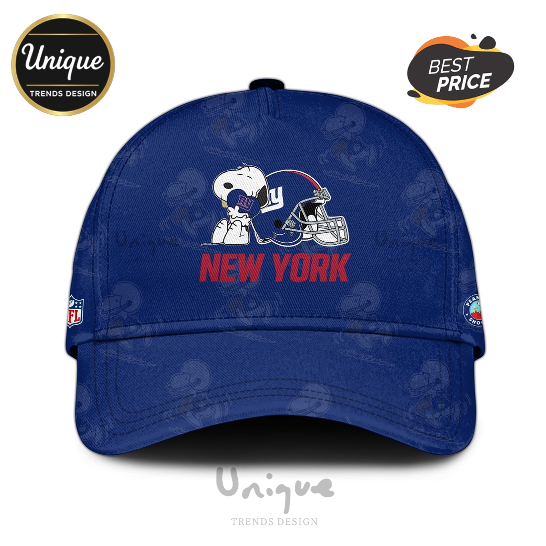 Complementing the hoodie is the matching cap, a classic six-panel baseball style constructed from durable cotton twill. Its color palette perfectly aligns with the hoodie, typically featuring the primary Giants blue, ensuring a cohesive and polished look when worn together. The front of the cap proudly displays an embroidered New York Giants logo, while a smaller, equally charming Snoopy motif, echoing the design on the hoodie, is artfully placed, possibly on the front or side panel. The pre-curved brim offers practical sun protection and contributes to the cap’s timeless appeal, while the adjustable strap at the back – whether a buckle, hook-and-loop, or snapback closure – guarantees a customized and secure fit for virtually any head size.