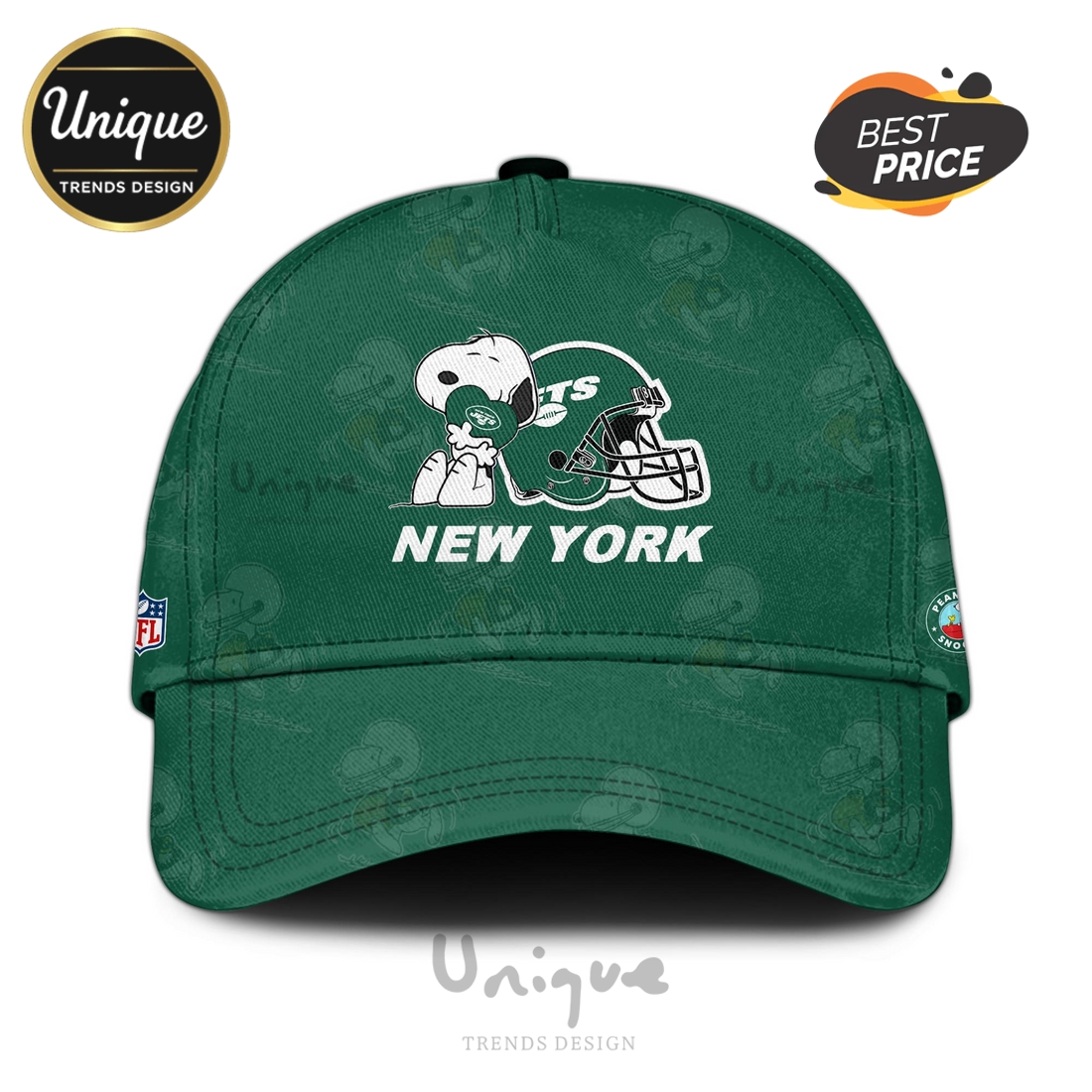 Complementing the hoodie is the matching baseball cap, crafted from durable yet breathable cotton twill. This classic six-panel design features a gently pre-curved brim, offering both sun protection and a universally flattering silhouette. Ventilation eyelets are strategically placed to ensure airflow, enhancing comfort during active wear or warmer conditions. The cap’s adjustable strap closure at the back, whether a snapback, buckle, or hook-and-loop, guarantees a personalized and secure fit for a wide range of head sizes. Its front panel mirrors the hoodie’s collaborative spirit with high-quality embroidered artwork. Here, Snoopy and Woodstock are once again depicted in a spirited Jets theme, their cheerful presence elevated by the crisp detailing of embroidery. A subtle NFL shield or Jets wordmark may be found on the side or rear, reinforcing its authenticity and official licensing.