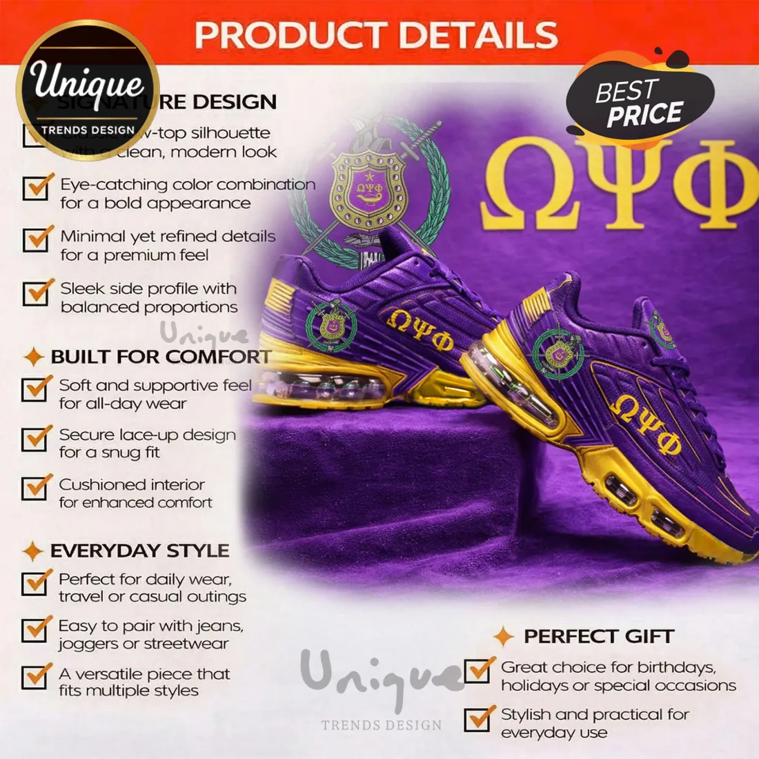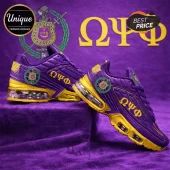 The Omega Psi Phi Purple & Gold Custom Fraternity TN Sneakers is built for the bold. It merges the legendary “Tuned” look with modern materials that actually feel good on your feet. Stop settling for mass-produced clones and grab a pair made specifically for you.