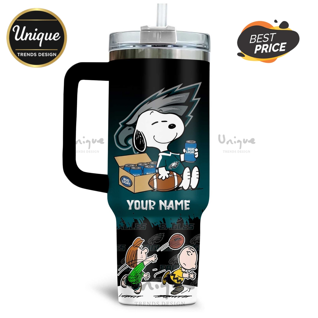 Beyond its impressive functionality, the aesthetic appeal of this tumbler is where it truly shines and caters to the specific desires of its target audience. It proudly showcases the iconic Philadelphia Eagles branding, incorporating the team’s distinctive colors and official logo, immediately signifying unwavering loyalty. This powerful display of team spirit is uniquely complemented by the beloved Snoopy character, depicted in an endearing Eagles-themed pose—perhaps wearing a mini jersey, kicking a football, or cheering enthusiastically. This playful integration of Snoopy adds a layer of nostalgia and universal appeal, making the tumbler not just a fan item, but a charming collectible. The inclusion of the Bud Light logo further enhances its game-day readiness, subtly or prominently associating it with the celebratory atmosphere of sports events and shared experiences. The printing quality is paramount, utilizing advanced techniques like UV printing or laser engraving to ensure the vibrant graphics are sharp, fade-resistant, and built to last as long as the tumbler itself.