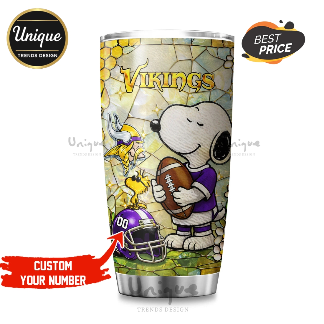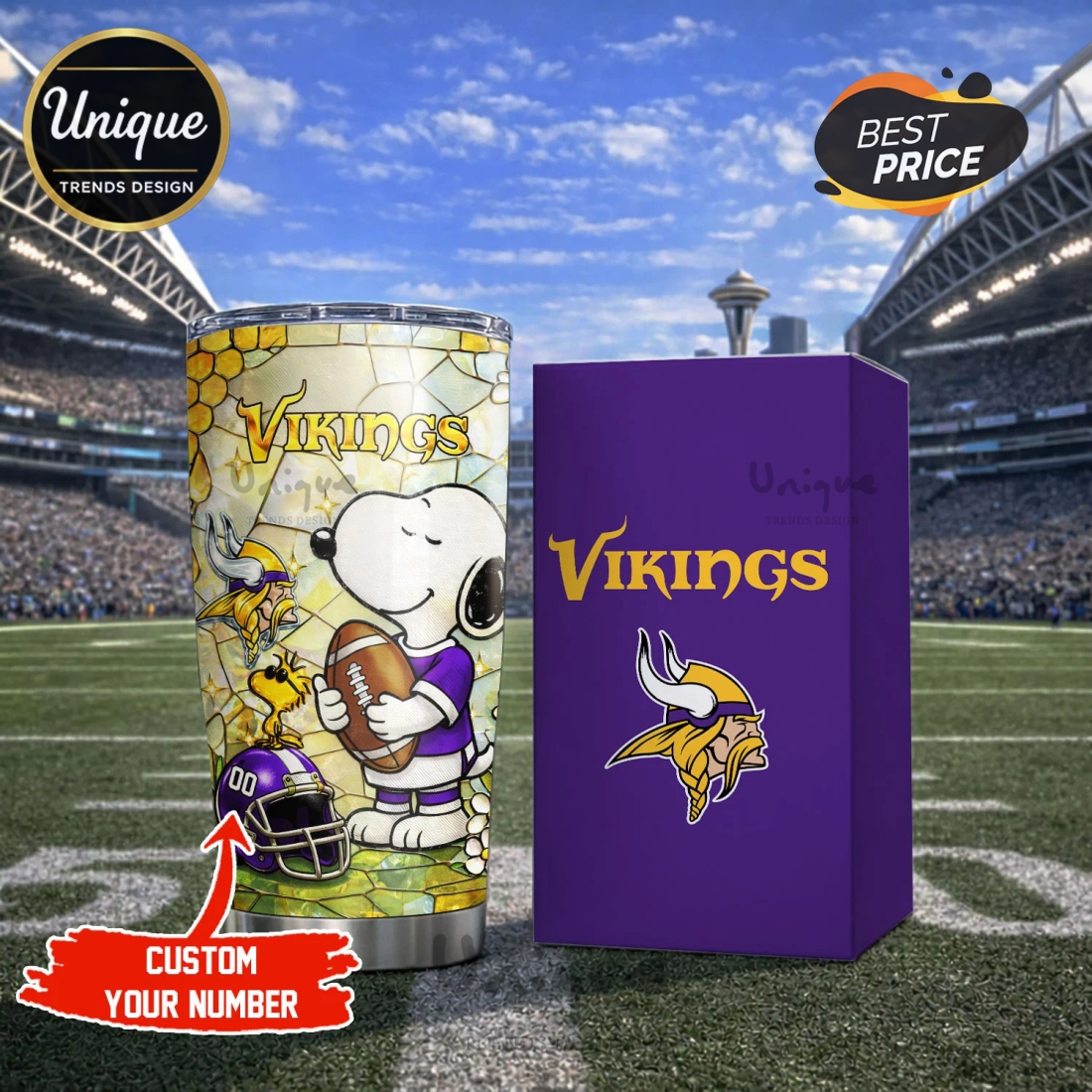Beyond its impressive thermal capabilities, the tumbler’s visual appeal is what truly sets it apart. It prominently features the officially licensed Minnesota Vikings logo and signature team colors, boldly declaring your allegiance to one of the NFL’s most passionate fan bases. What elevates this design to a unique level is the delightful integration of Snoopy, the beloved beagle, often depicted in a playful, spirited pose that perfectly encapsulates game-day excitement – perhaps sporting a miniature Vikings helmet or holding a football. This charming crossover appeals not only to die-hard Vikings supporters but also to fans of Charles M. Schulz’s iconic creation, creating a conversation piece that is both spirited and endearing. The vibrant graphics are applied with a durable, fade-resistant printing process, ensuring that your team and character pride remains sharp and vivid through countless uses and washes, resisting chips or peels that plague lesser quality products.