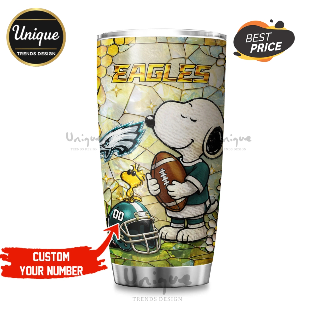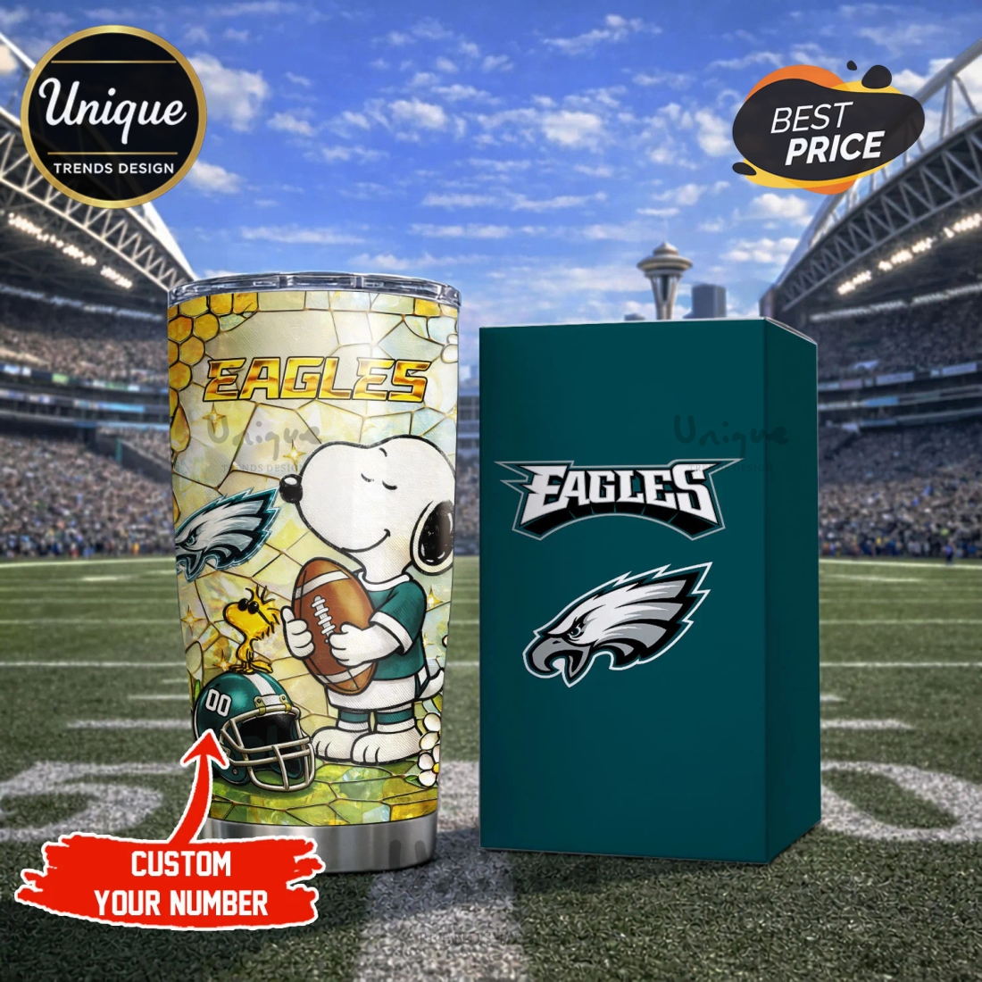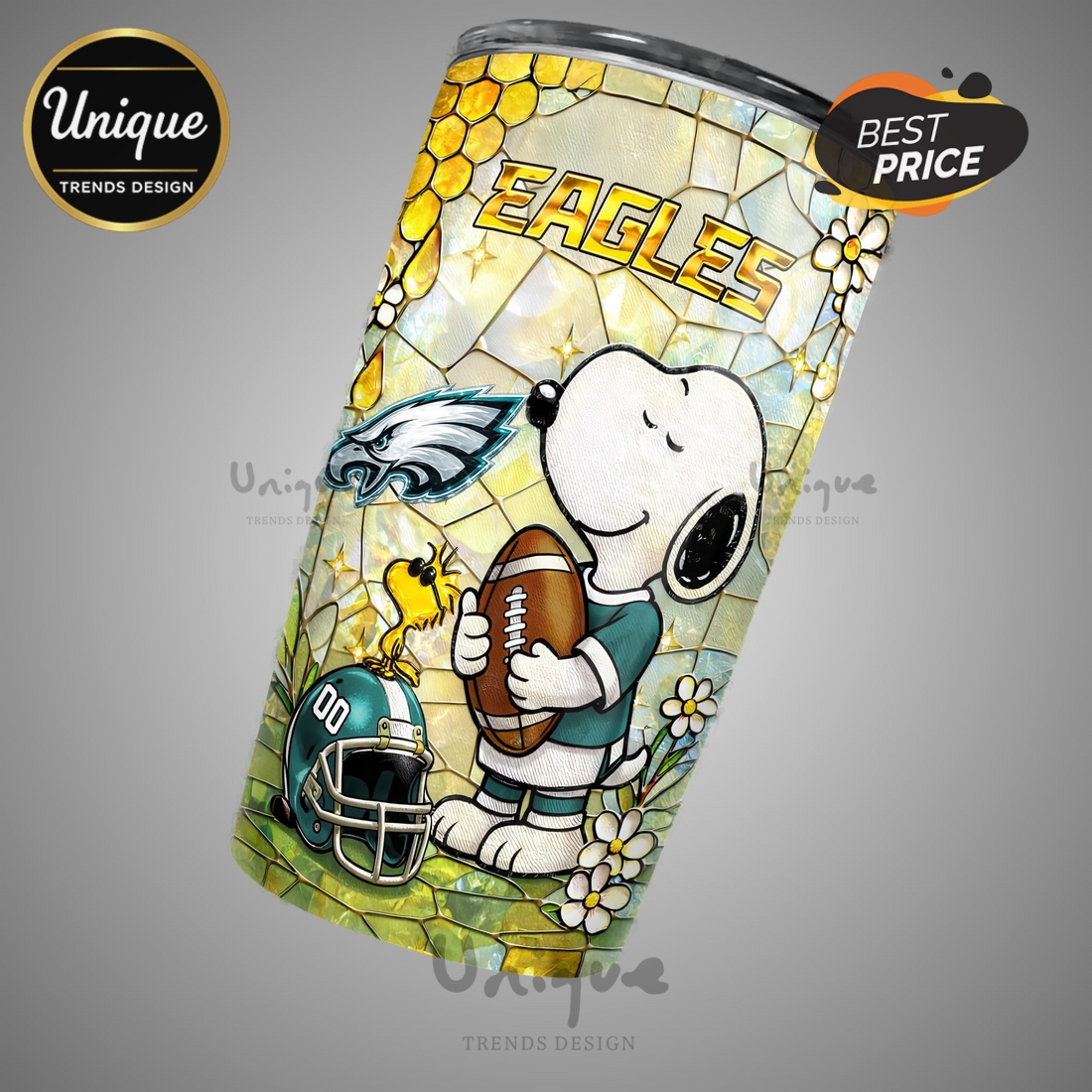 Visually, the tumbler is a striking declaration of allegiance, proudly displaying the iconic Philadelphia Eagles logo in its official, vivid team colors, meticulously rendered for maximum impact. This powerful emblem is creatively paired with an endearing depiction of Snoopy, the beloved Peanuts character, often presented in a manner that expresses strong team pride – perhaps wearing an Eagles jersey, a team hat, or engaged in a spirited pose that resonates with the energy of game day. The “Pride” aspect of the design speaks to the deep emotional connection and unwavering loyalty fans feel for their team, allowing users to showcase their unwavering support in a uniquely charming and distinctive way. The print quality is designed to withstand frequent use and washing, resisting fading or peeling, so your team and Snoopy remain vibrant and clear for years to come.